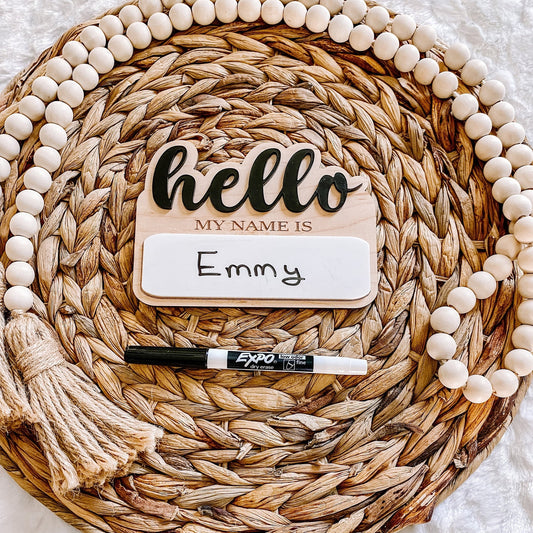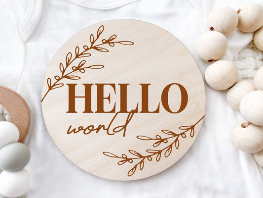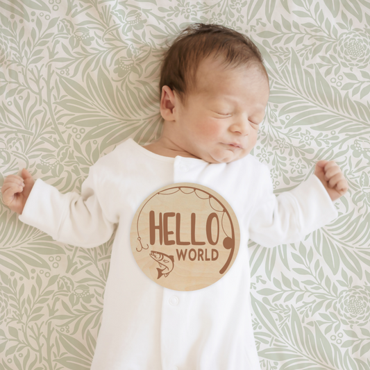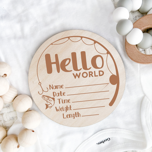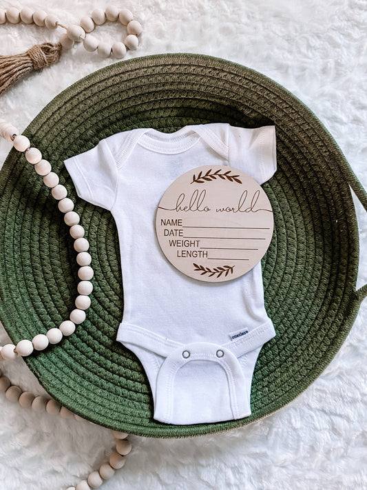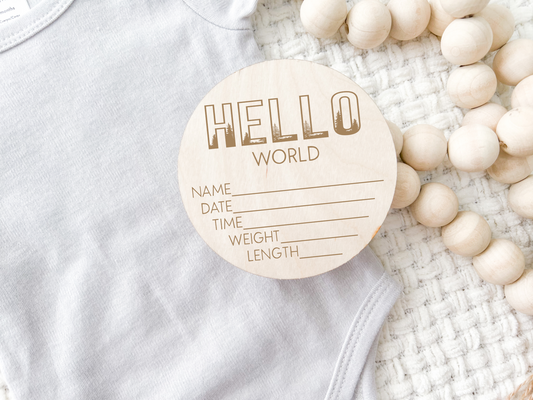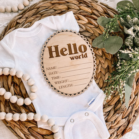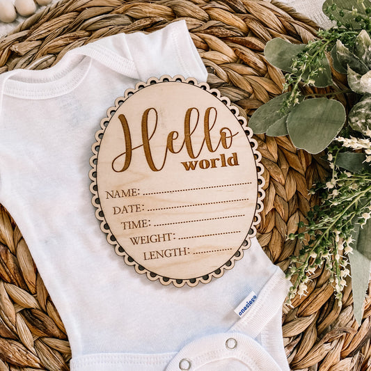 Scalloped Edge Hello World Birth Stat Sign - Cursive