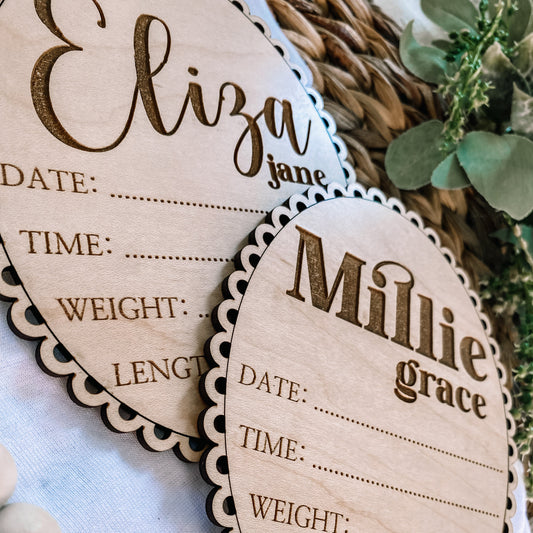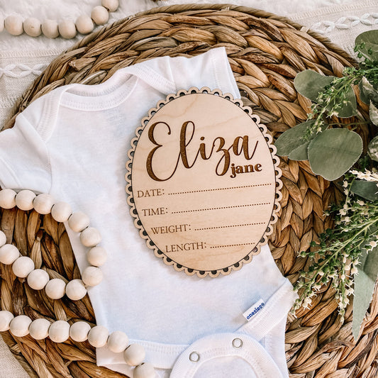 Custom Scalloped Edge Hello World Birth Stat Sign