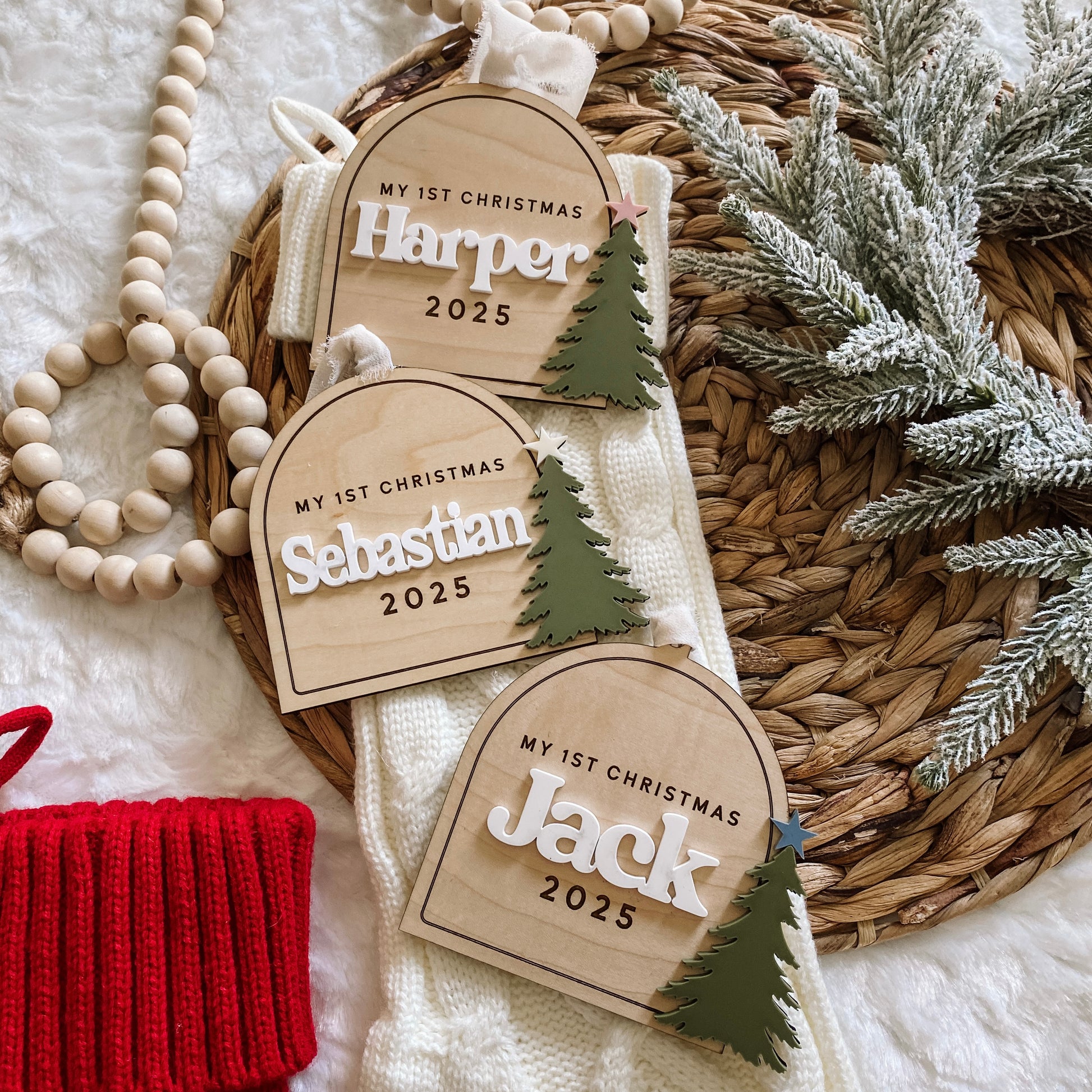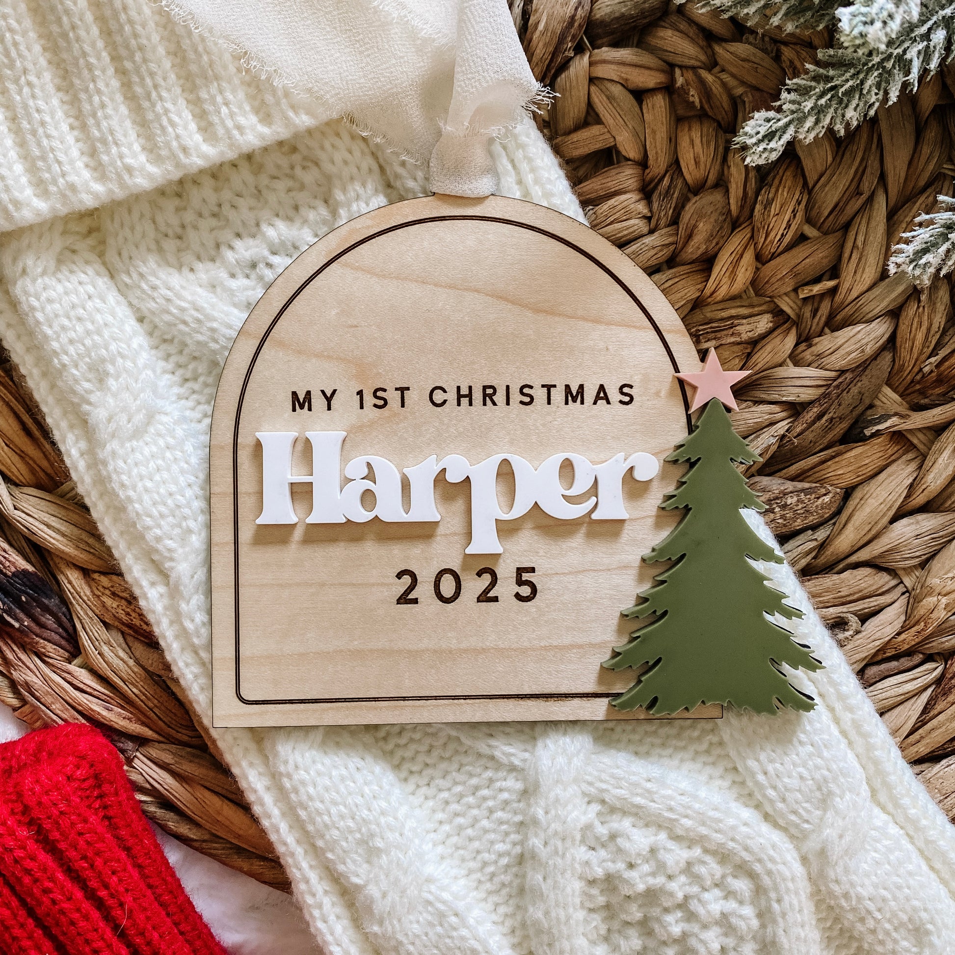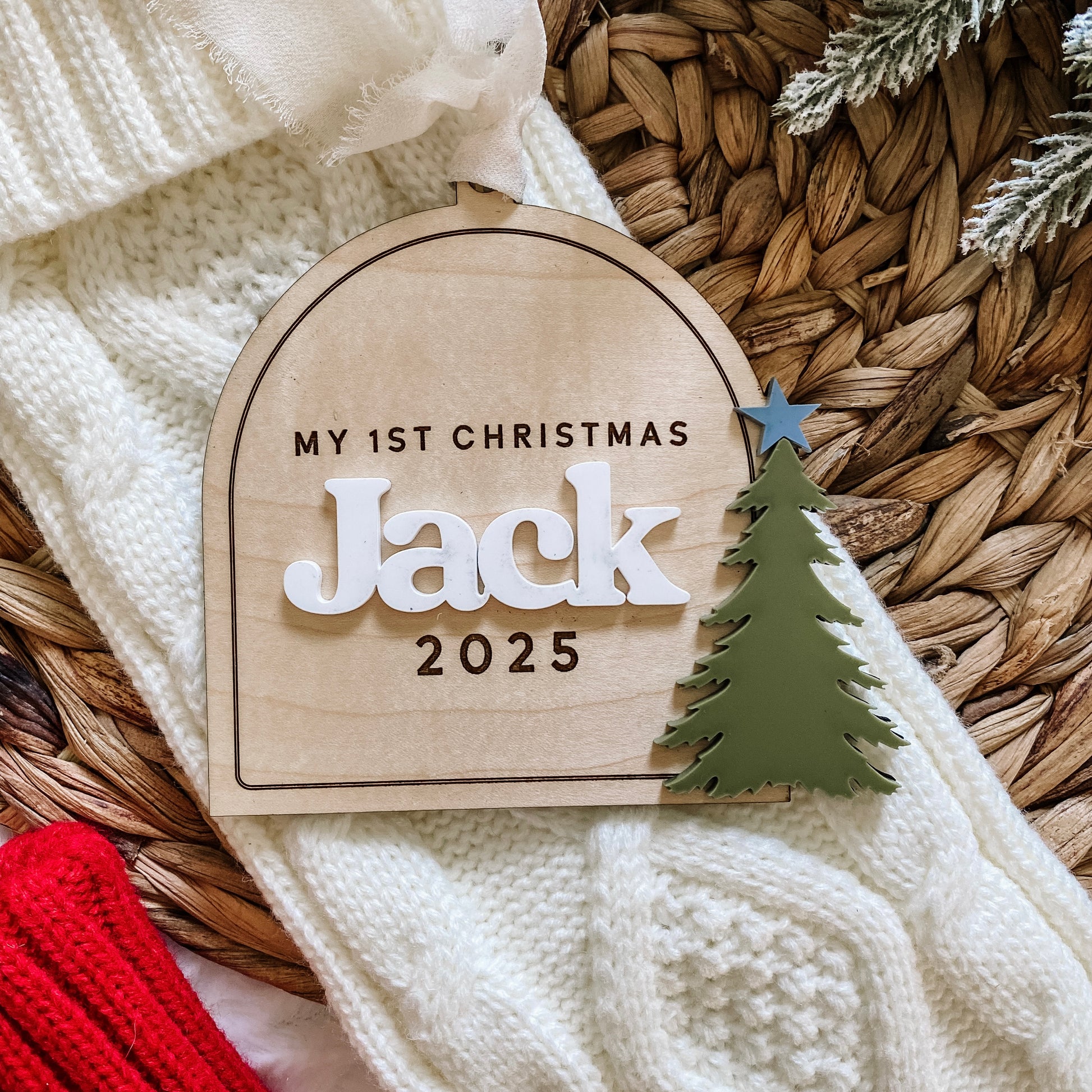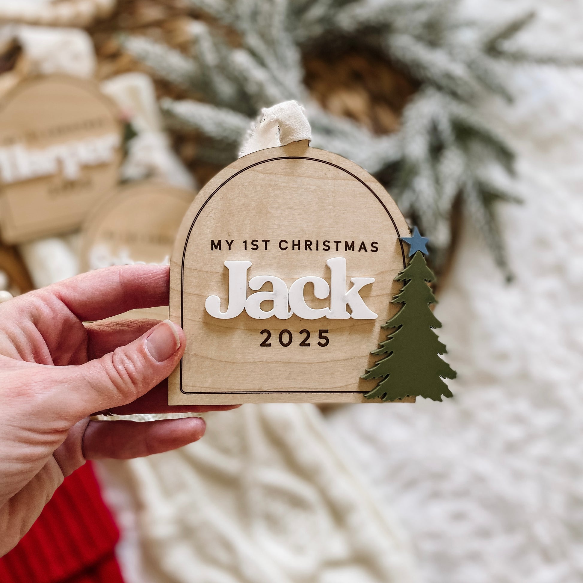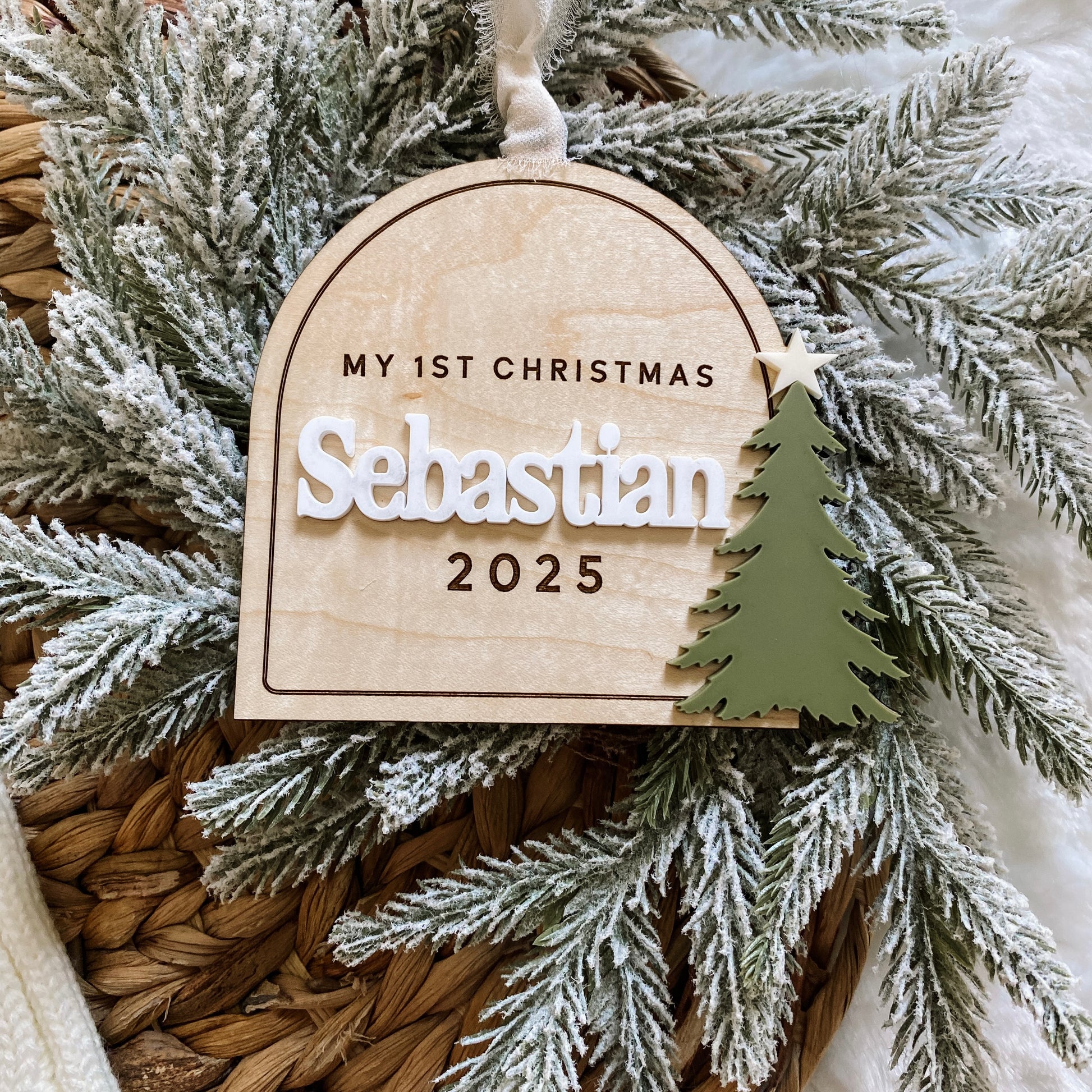 Celebrate your baby's milestone first Christmas with this enchanting personalized ornament. Featuring a charming tree design with a gleaming star, this keepsake captures the joy of parenthood in stunning 3D detail. Customize it with your little one's name and birth date to create a treasured decoration that tells your family's story. Year after year, this ornament becomes a cherished reminder of that magical first holiday—a beautiful heirloom to display proudly on your tree and eventually pass down as your child grows. Handcrafted with care, it's the perfect way to commemorate this precious moment and create lasting memories.